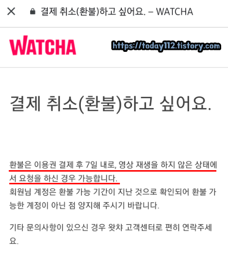 왓챠 환불은 위에서 알아봤던 해지와는 다르게 특별한 조건이 존재합니다. 왓챠 결제 취소 및 환불 조건은 이용권 결제 후 7일 내로 영상 재생을 하지 않은 상태에서만 환불 요청이 가능합니다. 만약 결제일로부터 7일이 넘었거나 영상을 하나라도 재생했다면 이용권 결제 취소 및 환불 신청은 불가능합니다.