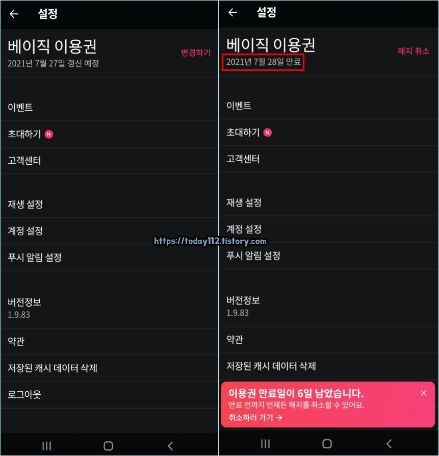 이제 이용권 해지가 제대로 되었는지 확인해줄 차례입니다. "마이페이지 > 설정(우측 상단 톱니바퀴 모양)"으로 가면 갱신 예정에서 '만료'로 바뀐 것을 보니 해지는 정상적으로 완료된 것 같네요.
