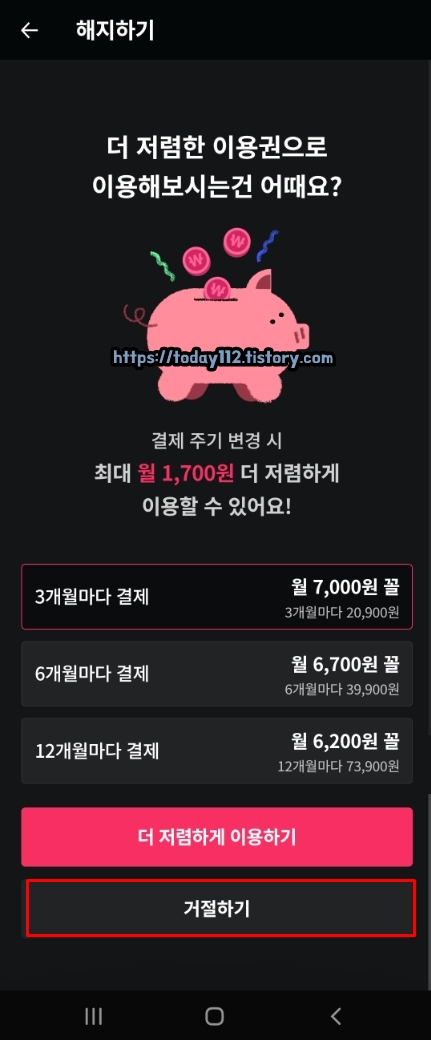 그러면 위와 같이 결제 주기를 변경해서 이용권을 좀 더 저렴히 이용하라는 문구가 나오는데요. 우리는 이런 가벼운 유혹에 넘어갈 만큼 의지가 약하지 않기 때문에 아래에 보이는 거절하기 버튼을 눌러줍니다.