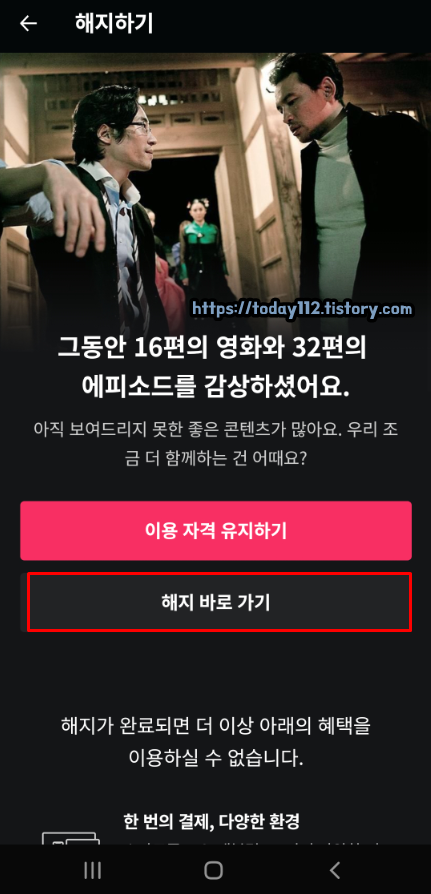 그런데 아직 왓챠는 우리를 포기하지 않았네요. 그래도 어쩔 수 없습니다. 이용 빈도도 줄었고, 돈도 조금 아깝게 느껴지기 때문이죠. 아래에 보이는 '해지 바로 가기'를 눌러 더욱 강경하게 대처해줍니다.
