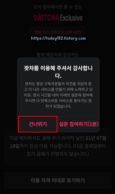 그러면 이렇게 이용권 해지가 완료됩니다. 설문 조사하는 것은 조금 귀찮으니까 그냥 여기서 '건너뛰기'만 눌러주세요.