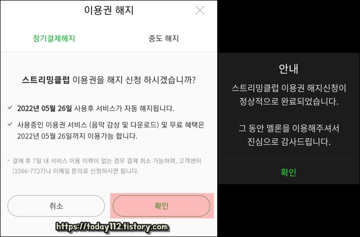 여기서 '확인'을 눌러주면 이용권 자동 결제 해지가 완료됩니다.