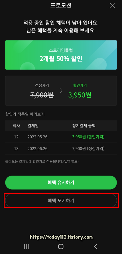만약 현재 이용 중인 할인 혜택이 있다면 이렇게 안내 창이 뜰 것인데요. 혜택 이용이 필요 없고, 다음 결제일에 자동 결제되지 않도록 하고 싶다면 아래에 보이는 '혜택 포기하기'를 눌러주면 됩니다.