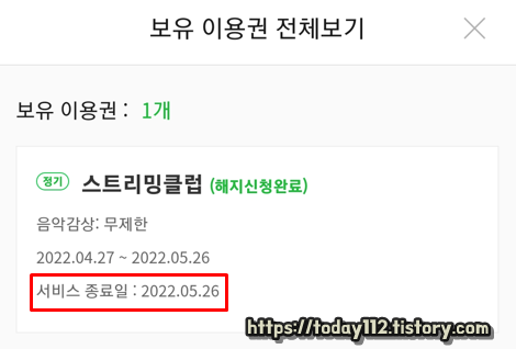 자동 결제 해지가 완료되면 이렇게 '서비스 종료일'이 표시됩니다. 이 이후부터는 자동 결제가 되지 않습니다.