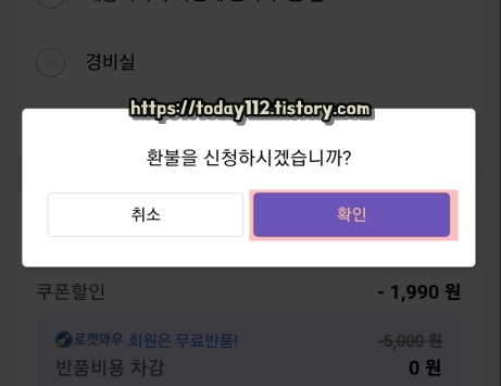 "환불을 신청하시겠습니까" 확인 창이 뜨면 '확인'을 눌러줍니다.
