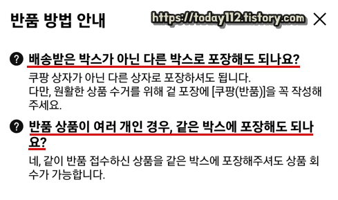 제품 포장은 배송받은 박스가 아닌 다른 박스로 포장해도 됩니다. 만약 다른 박스로 포장했다면, 원활한 상품 수거를 위해 포장 겉면에 매직으로 "쿠팡(반품)"이라고 적어서 내놓으시길 바랍니다.