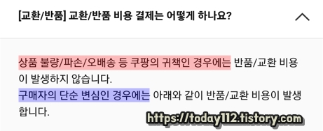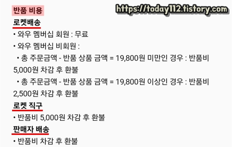 로켓 배송 상품 : 와우 멤버십 회원이라면 반품 비용이 무료이지만, 와우 멤버십 회원이 아니라면 2,500원 또는 5,000원의 반품 비용이 발생됨.