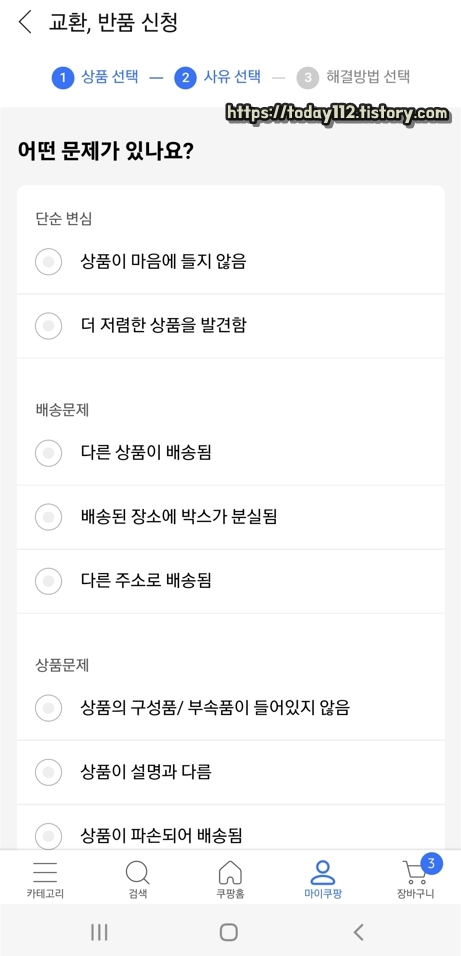 이어서 반품 사유를 선택해줍니다. 선택 가능한 반품 사유는 단순 변심, 배송 문제, 상품 문제 등입니다. 반품 사유가 초기 불량, 구성품 부족 등 판매자 귀책사유가 아니라면 구매자가 반품 비용을 지불해야 합니다.