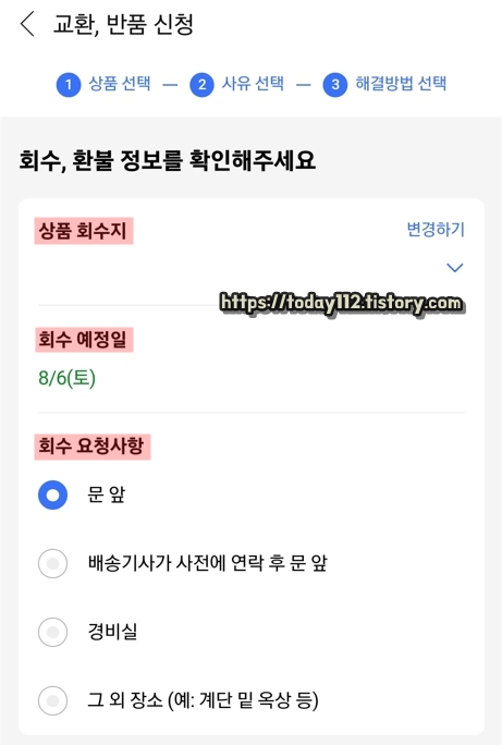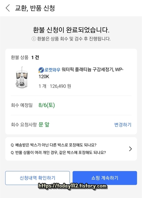 그러면 이렇게 환불 신청이 완료됩니다. 이제 해당 상품을 구성품 누락 없이 받았던 그대로 깔끔하게 포장해서 회수 예정일 아침까지 상품을 문 앞에 내놓으면 됩니다.