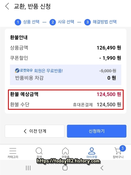 이어서 반품 비용, 환불 예상 금액, 결제 수단을 확인해줍니다. 반품 처리는 기본적으로 구매 시 이용했던 결제 수단으로 진행됩니다.