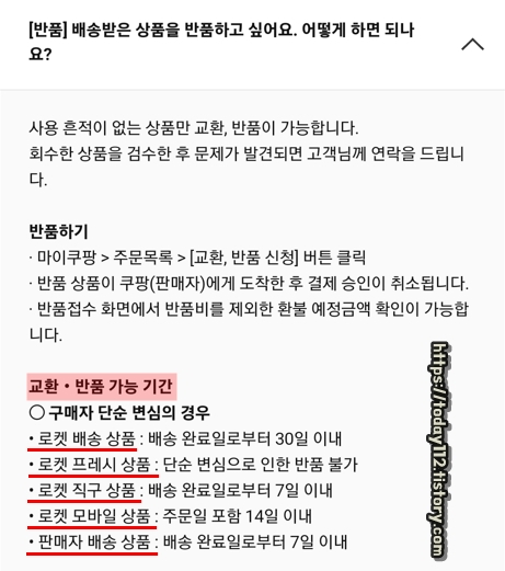 <쿠팡 상품별 교환 및 반품 가능 기간>
