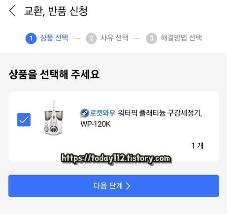 반품할 상품을 확인한 후, 다음 단계 버튼을 눌러줍니다.