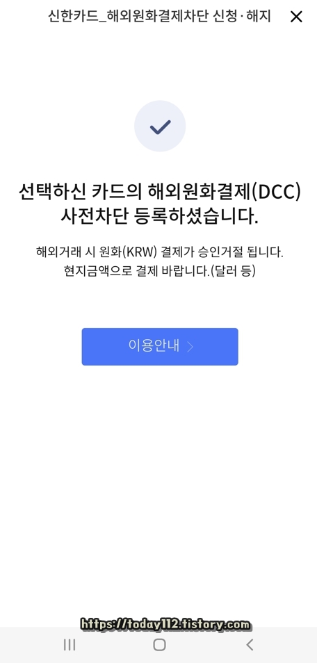 그러면 이렇게 해외 원화결제 차단 서비스 신청이 완료됩니다. 이제부터는 해외 거래 시 현지 금액 또는 달러로 표시된 상품만 결제할 수 있습니다. (원화로 표시된 상품을 구매하게 되면 결제가 이루어지지 않음.)