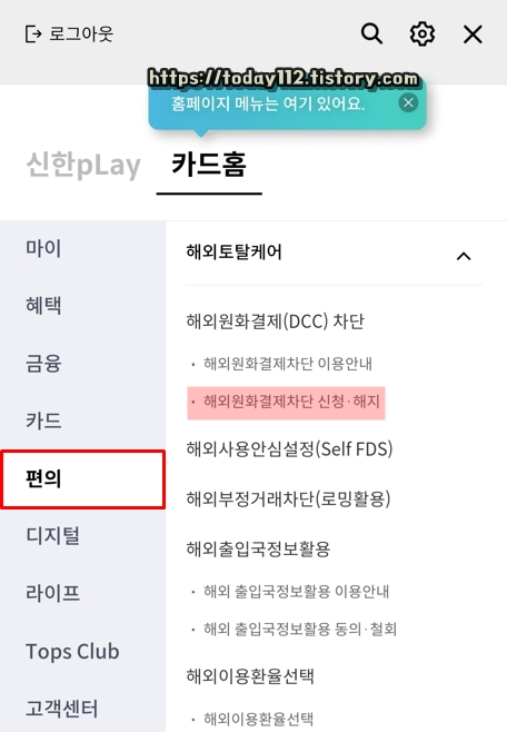 카드홈 탭으로 이동한 후, 편의 메뉴에 보이는 '해외원화결제차단 신청 및 해지'를 눌러줍니다.