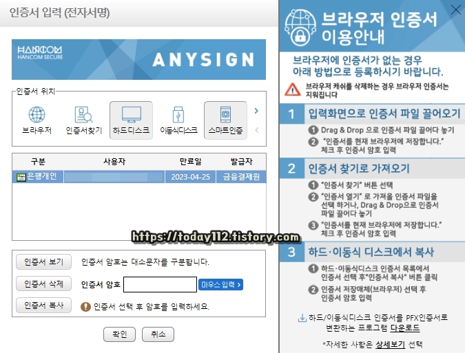그러면 이렇게 인증서 입력 창이 뜨는데요. 여기서 공동인증서를 선택한 후, 비밀번호를 입력해 본인 인증을 해줍니다.
