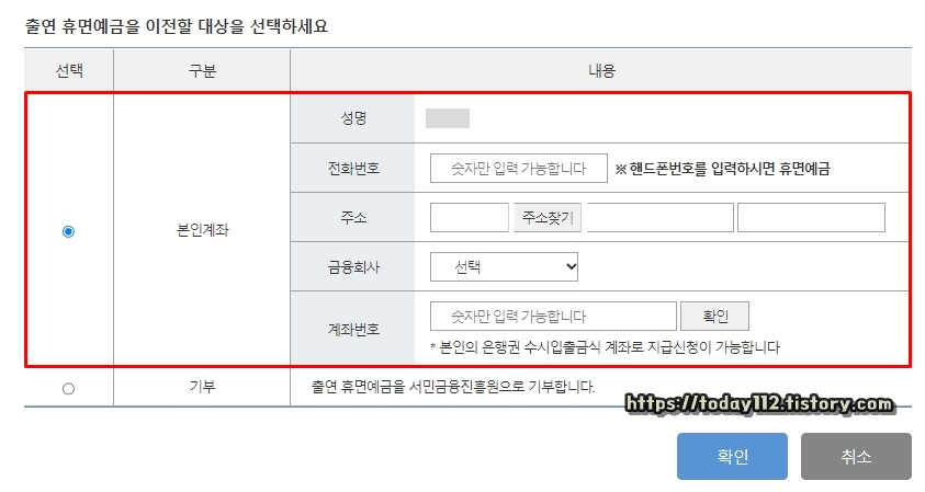 본인 계좌로 휴면 예금 잔액을 받고 싶다면 전화번호, 주소, 은행, 계좌번호만 입력해주면 됩니다.